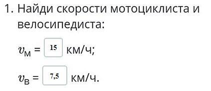 б) велосипедиста υв = Sв / tв = 30/4 = 7,5 км/ч.