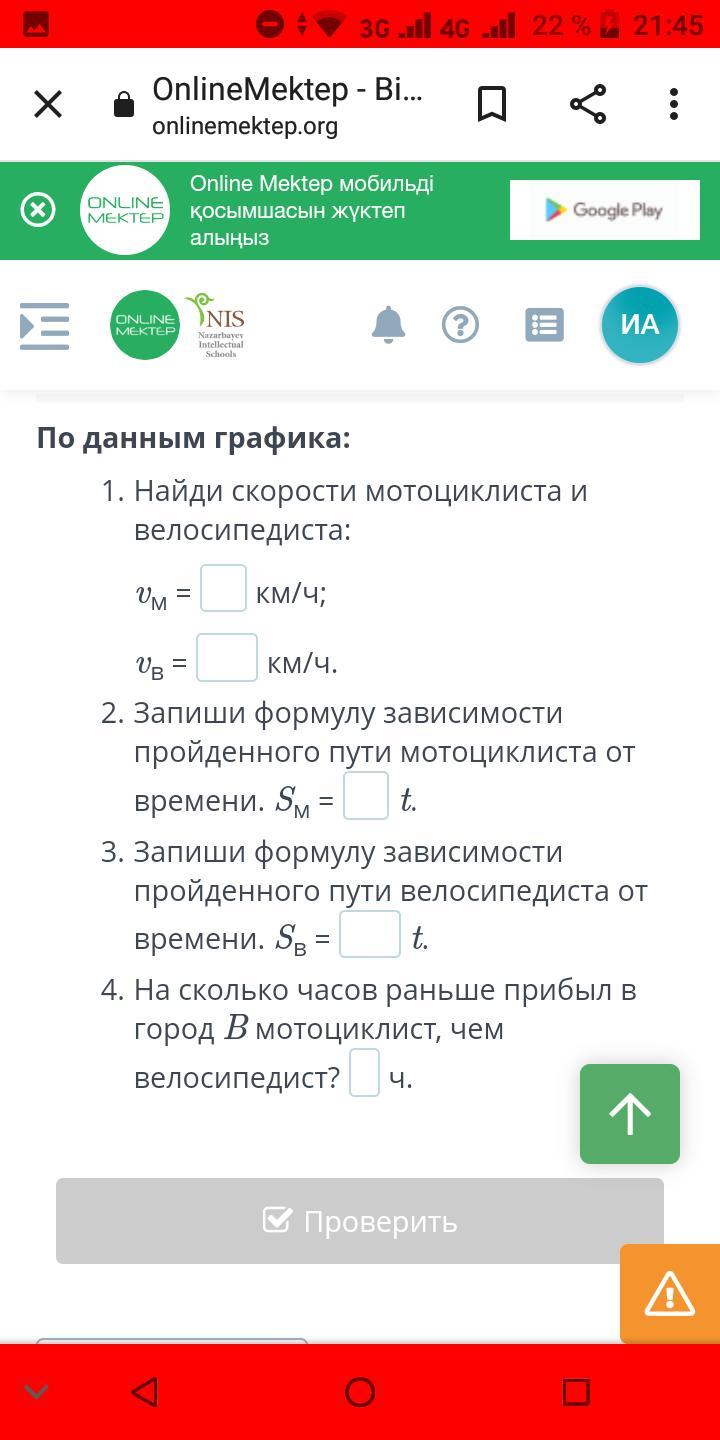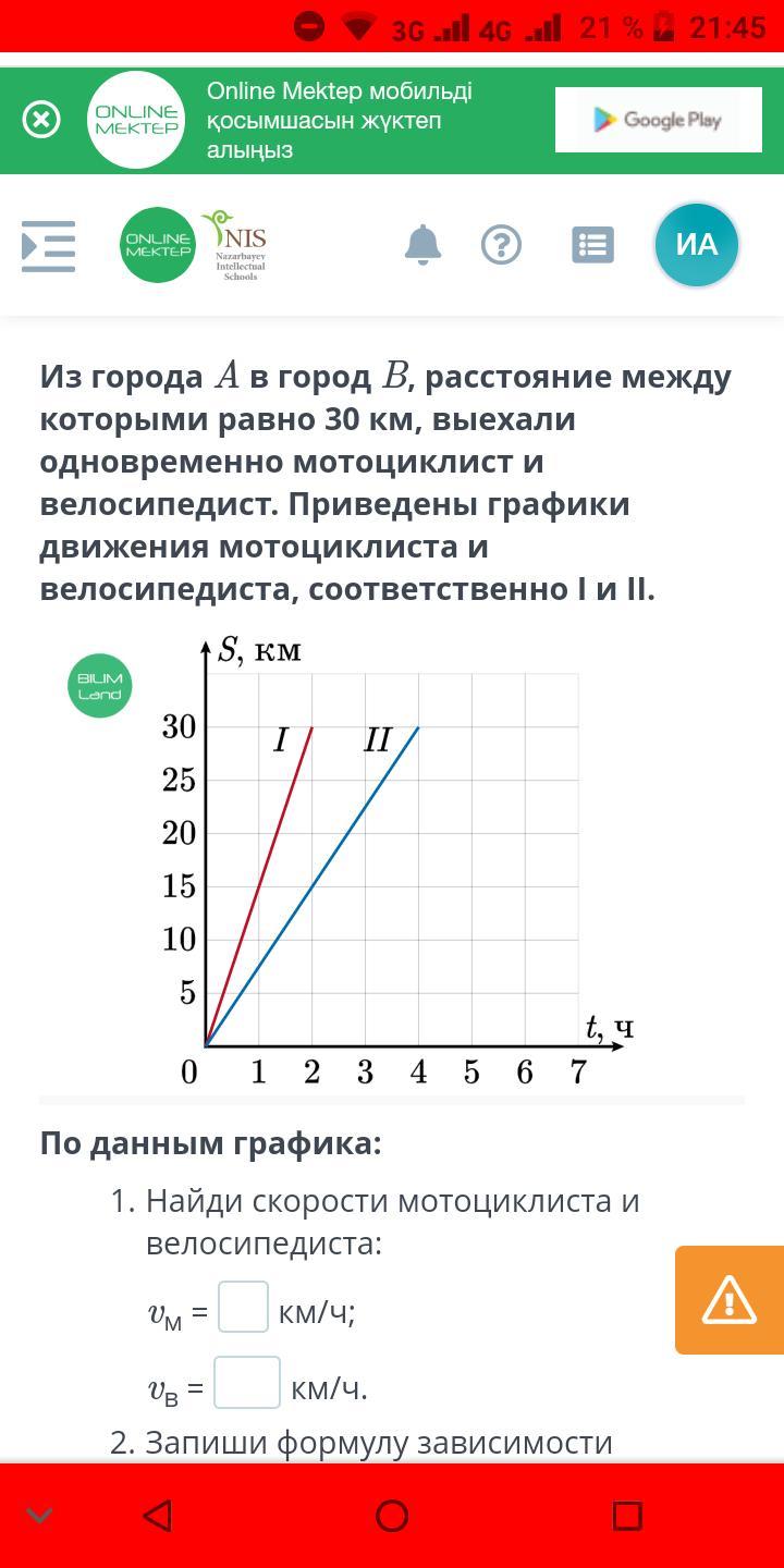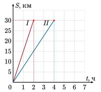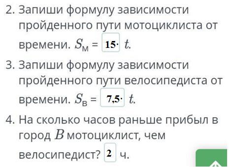 Из города A в город B, расстояние между которыми равно 30 км, выехали одновременно мотоциклист и велосипедист. Приведены графики движения мотоциклиста и велосипедиста, соответственно I и II. По данным графика: Найди скорости мотоциклиста и велосипедиста: vм = 15 км/ч; vв = 7,5 км/ч. Запиши формулу зависимости пройденного пути мотоциклиста от времени. Sм = t. Запиши формулу зависимости пройденного пути велосипедиста от времени. Sв = t. На сколько часов раньше прибыл в город B мотоциклист, чем велосипедист? 2 ч.