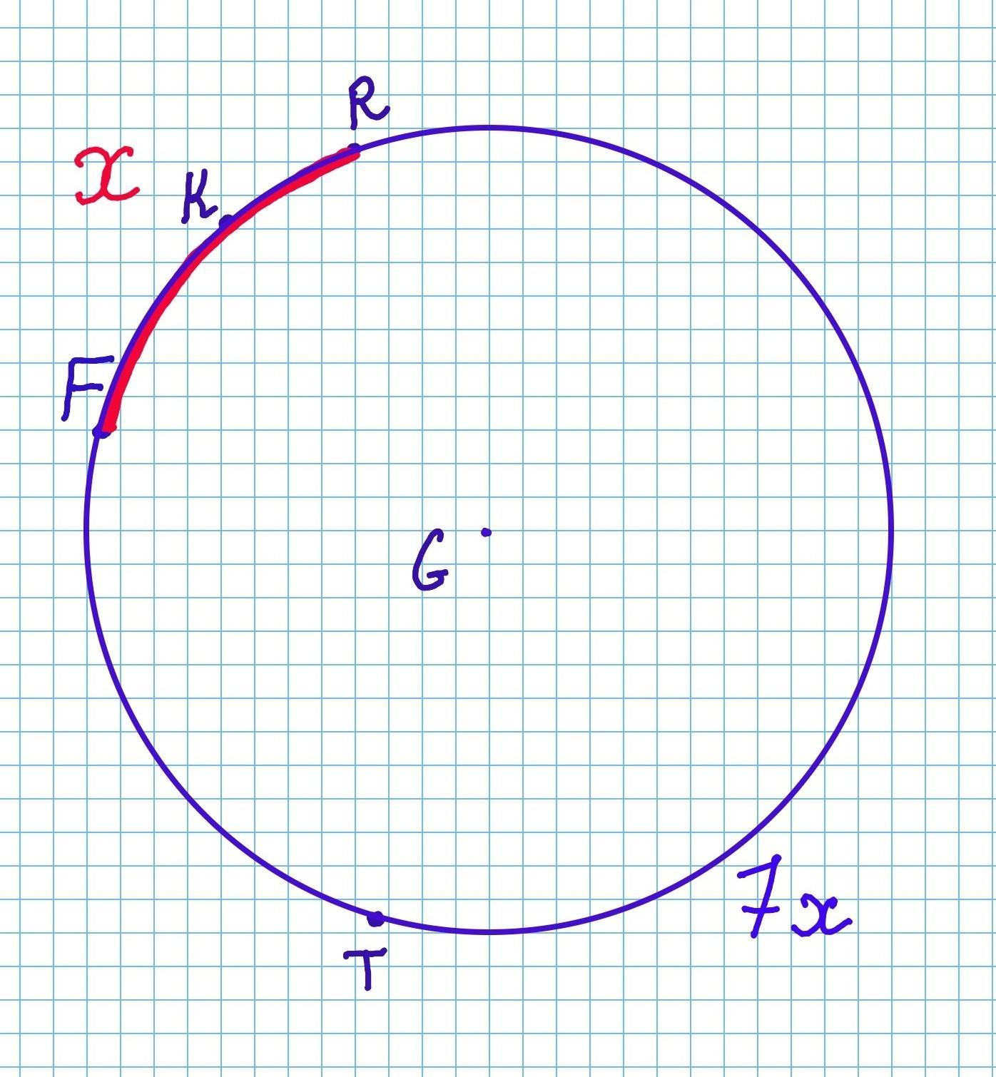 На окружности с центром G отметили точки R,T,F и K (в приведённом порядке).Определи градусную меру дуги RTF если известно, что она в 7 раз больше градусной меры дуги FKR.