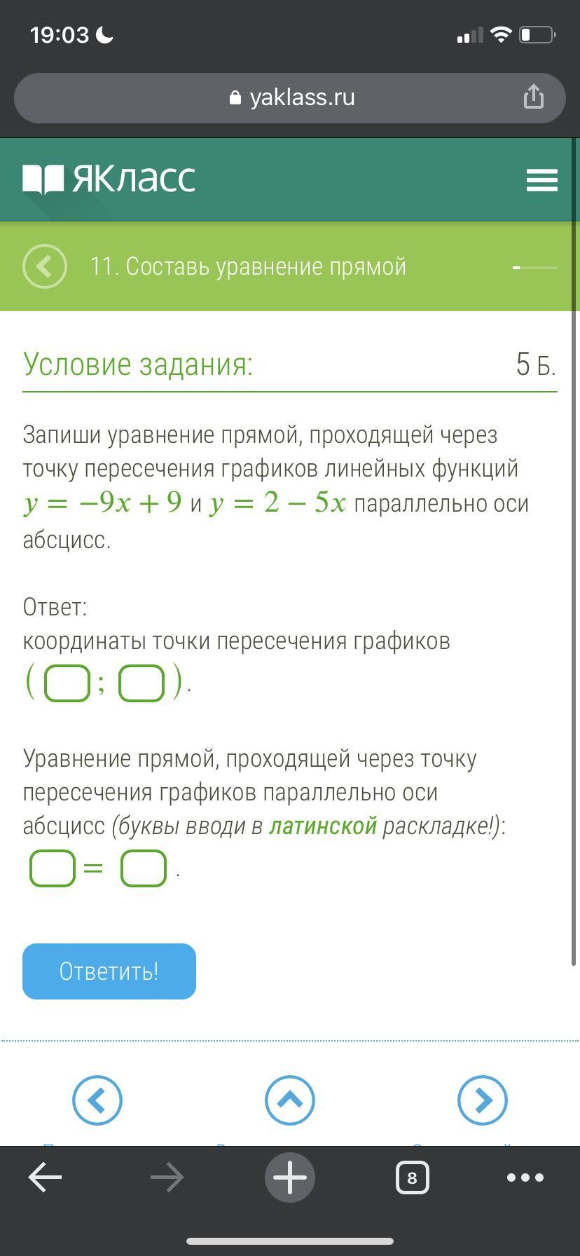 -9х+9=2-5х; 4х=7; х=7/4=2,25; у=2-5х=2-5*2,25=-9,25; Точка пересечения(в обыкновенных дробях) (7/4;-37/4). Уравнение прямой у=-37/4, ну, или у=-9,25. (Не знаю, в каком виде нужен ответ, поэтому приведен в двух вариантах).