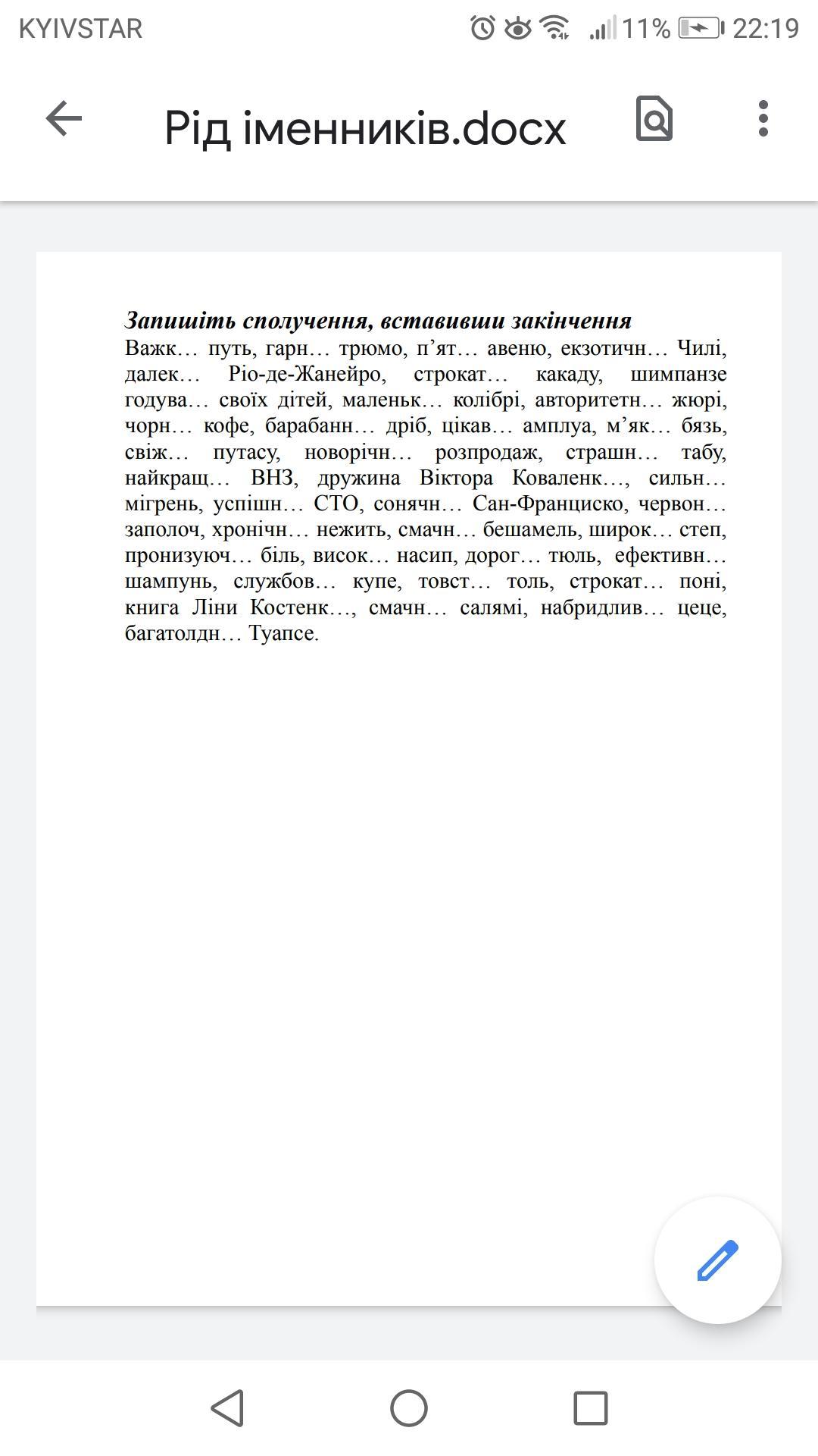 Гарна путь, гарне трюмо, п'яте авеню, екзотичне Чилі, далеке Ріо - де - Жанейро, строкате какаду, шимпанзе годував своїх дітей, маленьке колібрі, авторитетне жюрі, барабанна дріб, цікаве амплуа, м' яка бязь, свіже путасу, новорічний розпродаж, стрпшне табу, найкраще ВНЗ, дружина Віктора Коваленка, сильна мігрень, успішне СТО, сонячне Сан - Франциско, червоне заполоч, хронічна нежить, смачна бешшамель, широкий степ, пронизуюча біль, високий насип, дорога тюль, ефективний шампунь, служблве купе, строкате поні, книга Ліни Костенко,