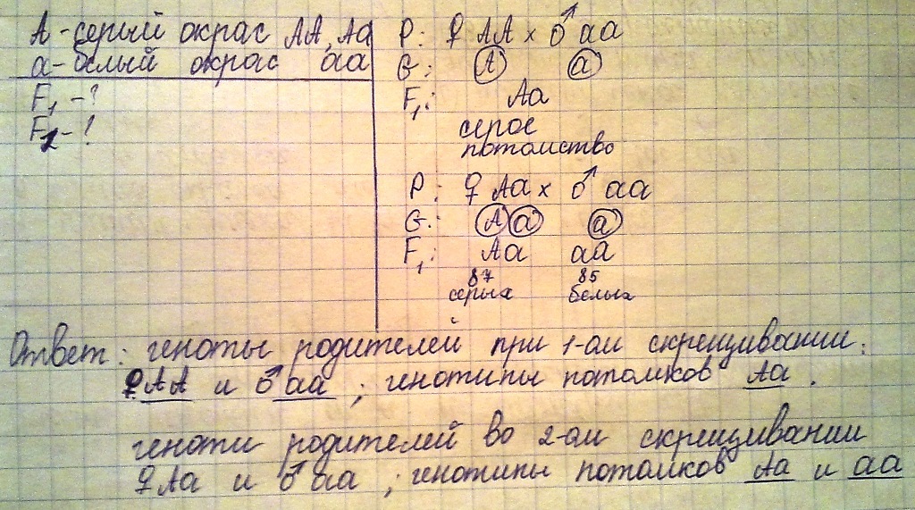 При скрещивании серых кур с белыми все потомство оказалось серым. В результате второго скрещивания этого серого потомства опять с белыми получено 172 особи, из которых было 85 белых и 87 серых. Каковы генотипы исходных форм и их потомков в обоих скрещиваниях?