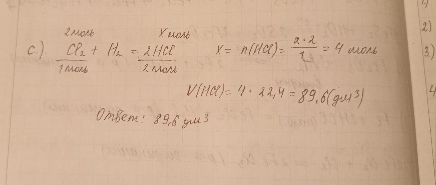 с) какой объём (н.у) хлороводорода можно получить из 2 моль хлора?