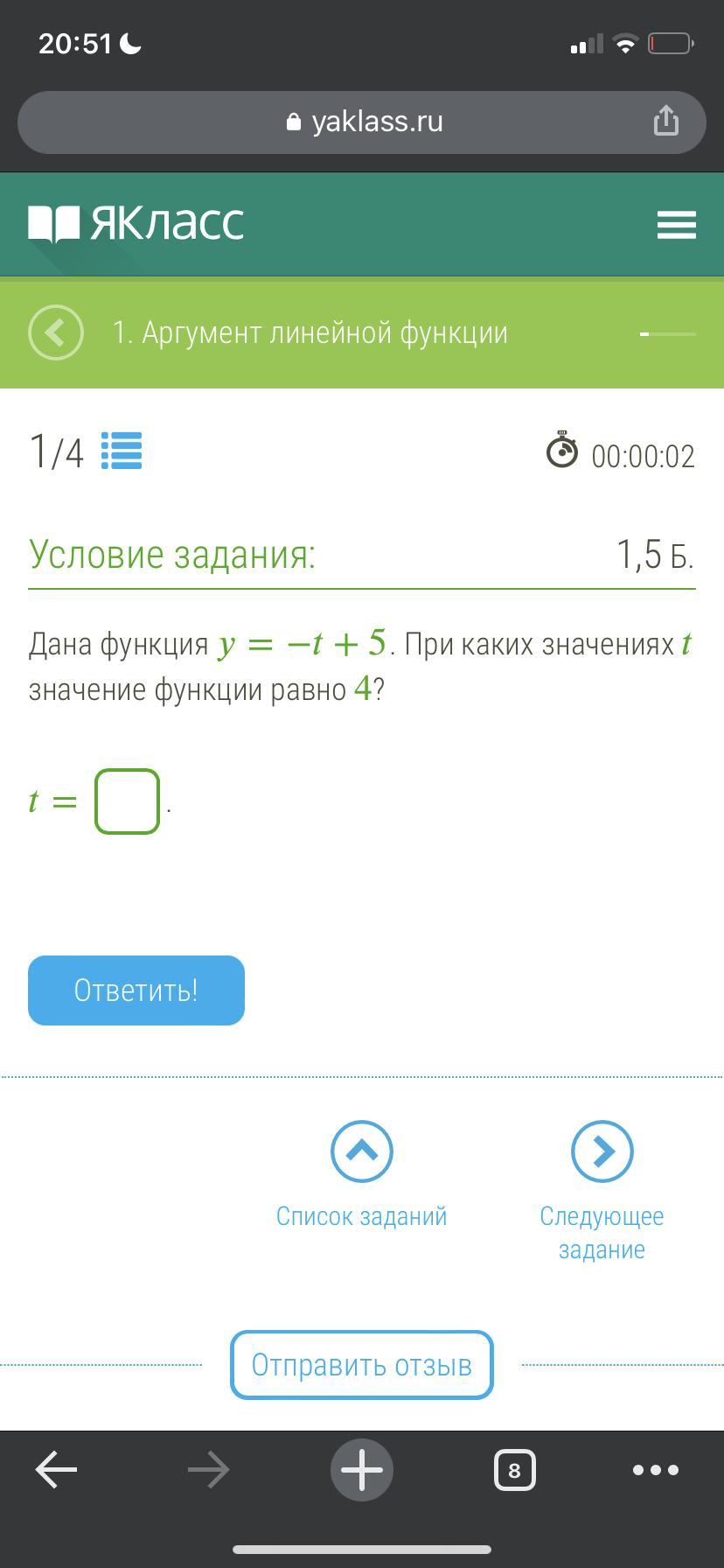 Если мы возьмем значение t = 1, то значение функции y будет равно 4