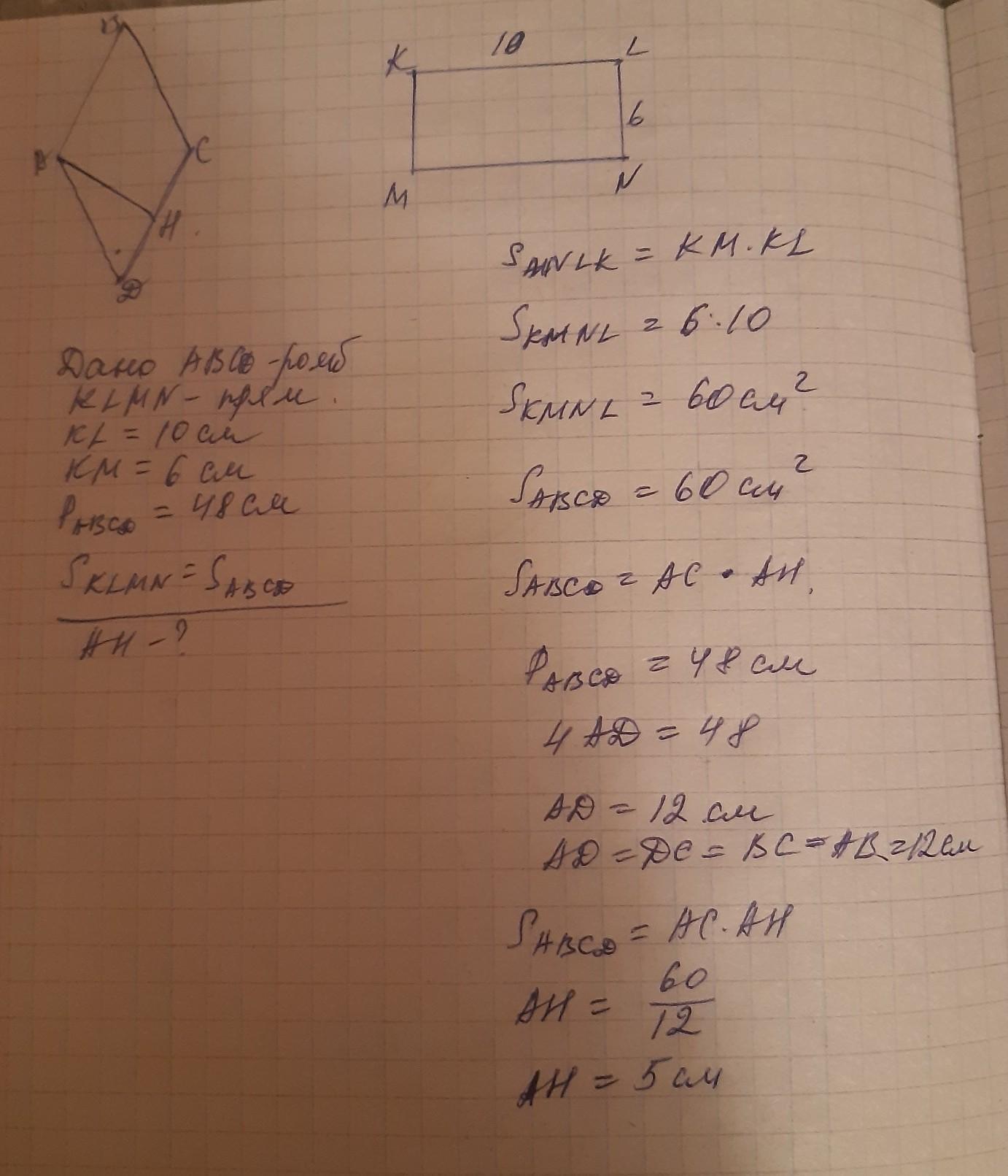 Прямокутник із сторонами 6см і 10см рівновеликий ромбу із периметром 48см. Знайдіть висоту нромба.