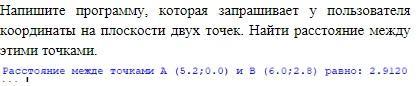 print(round(np.sqrt((float(input("x2: "))-float(input("x1: ")))**2 + (float(input("y2: "))-float(input("y1: ")))**2), 4))