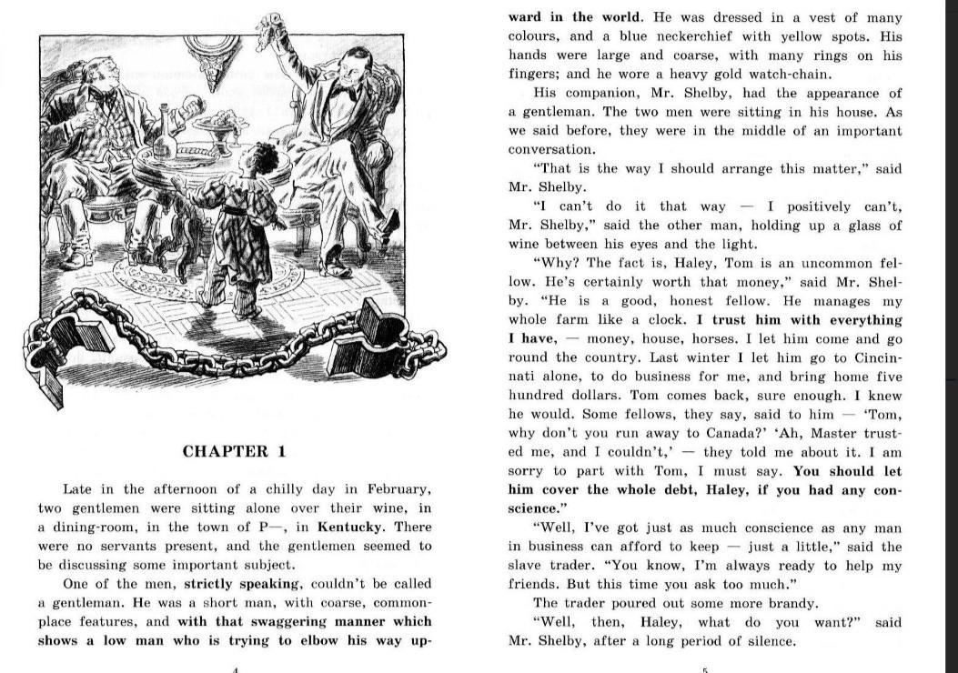 Once in the afternoon of a chilly day in February two men were discussing something. One of the men was called Haley, he was a slave trader. The other man was Mr. Shelby, a slave owner. The meeting took place in Mr. Shelby's house.