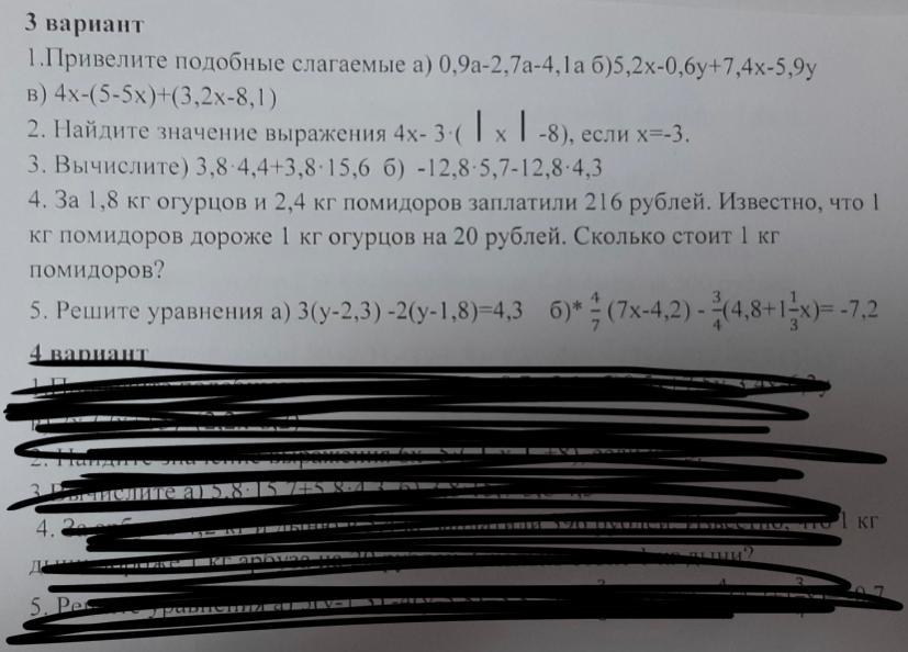задача: за 1,8 кг огурцов и 2,4 кг помидоров заплатили 216 руб известно, что 1 кг помидорчиков дороже 1 кг огурцов на 20 руб сколько стоит 1 кг помидоров? решите уравнения: а) 3(у-2,3)-2(у-1,8)=4,3 б) 4/7(7x-4,2)-3/4(4,8+1 1/3x)=-7,2 (последнее Б уравнение не обязательно) пожалуйста помогите ;(