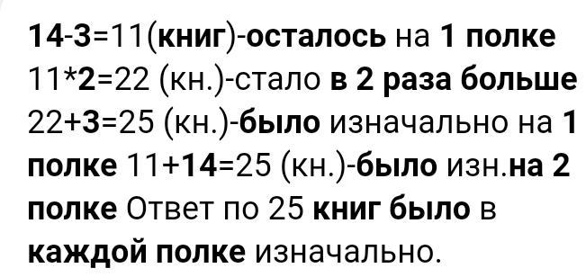 На двух полках стояло по ровну книг. Когда с первой полки взяли 3 книги, а со второй 14, то на первой полке осталось в 2 раза больше книг,чем на второй. Сколько книг было на каждой полке в начале