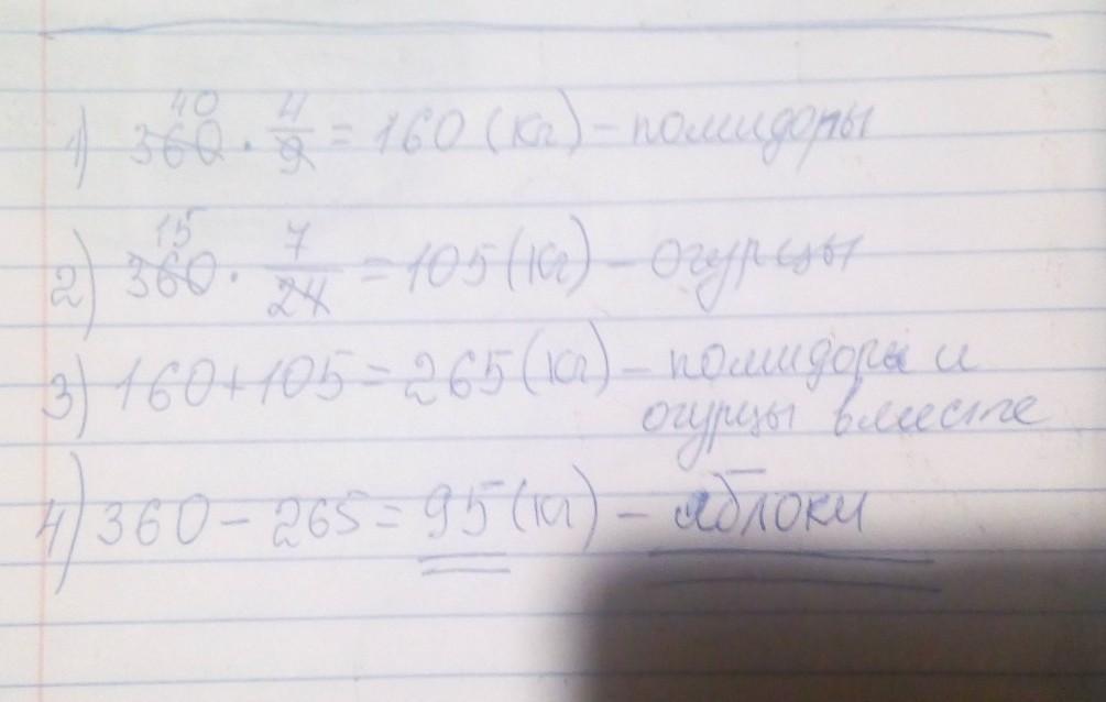 В магазин привезли 360 кг овощей. Из них 4/9- составляют помидоры, 7/24- огурцы, а остальное яблоки.Сколько кг яблок привезли в магазин? Краткое запись чертежи фотки скинутье пж