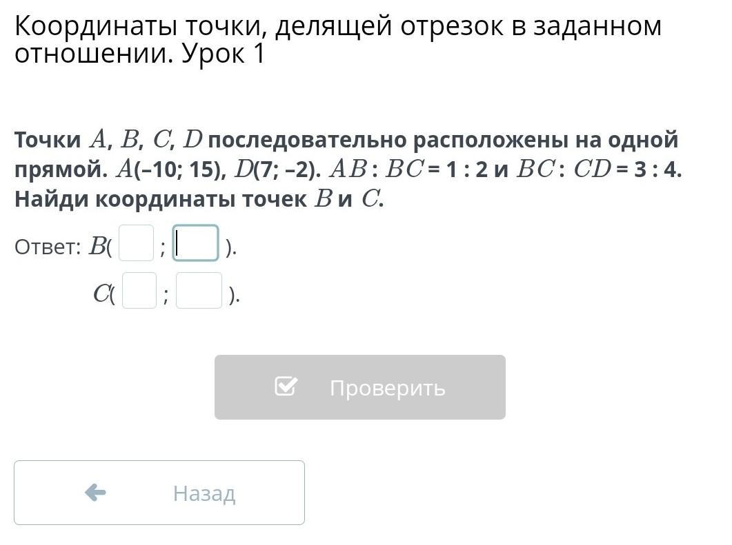Точки A, B, C, D последовательно расположены на одной прямой. A(–10; 15), D(7; –2). AB : BC = 1 : 2 и BC : CD = 3 : 4. Найди координаты точек B и C.