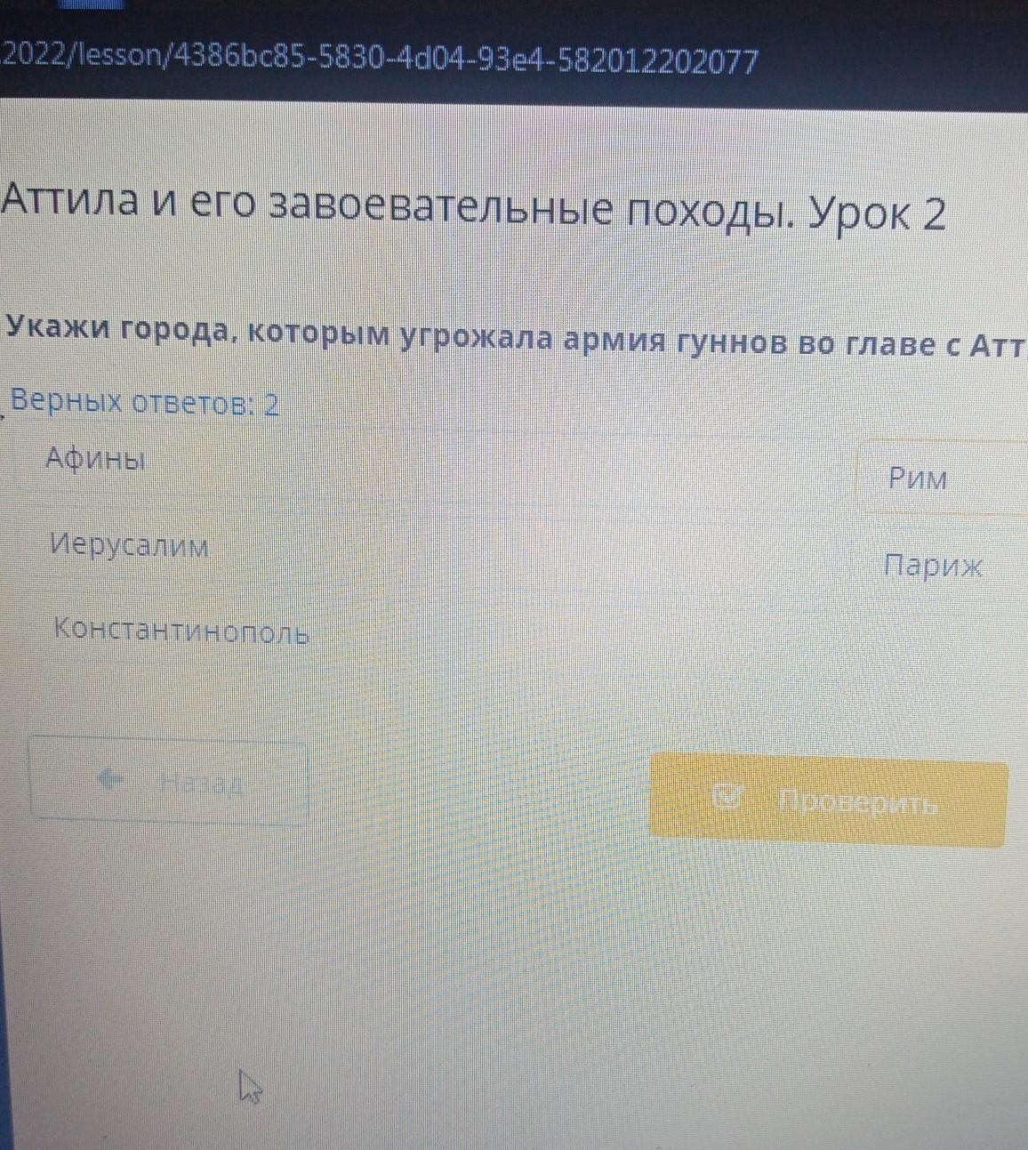 Аттила и его завоевательные походы. Урок 2 Укажи города, которым угрожала армия гуннов во главе с Аттилой. Верных ответов: 2 Афины Рим Иерусалим Париж Константинополь С Проверить