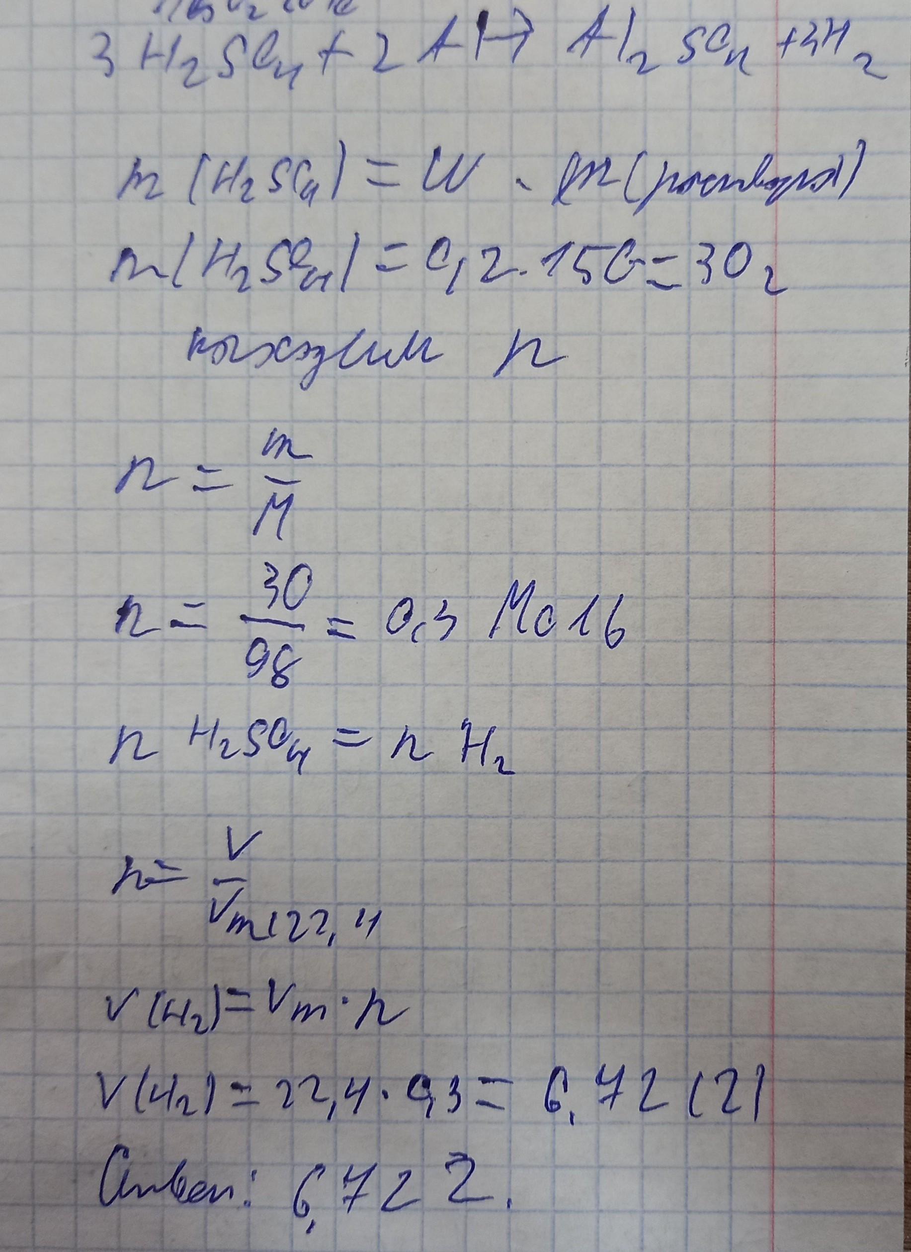 вычеслите обьем водорода образуешегося в результате реакции между 150г 20% серной кислоты и избытком алюминия