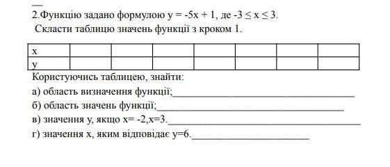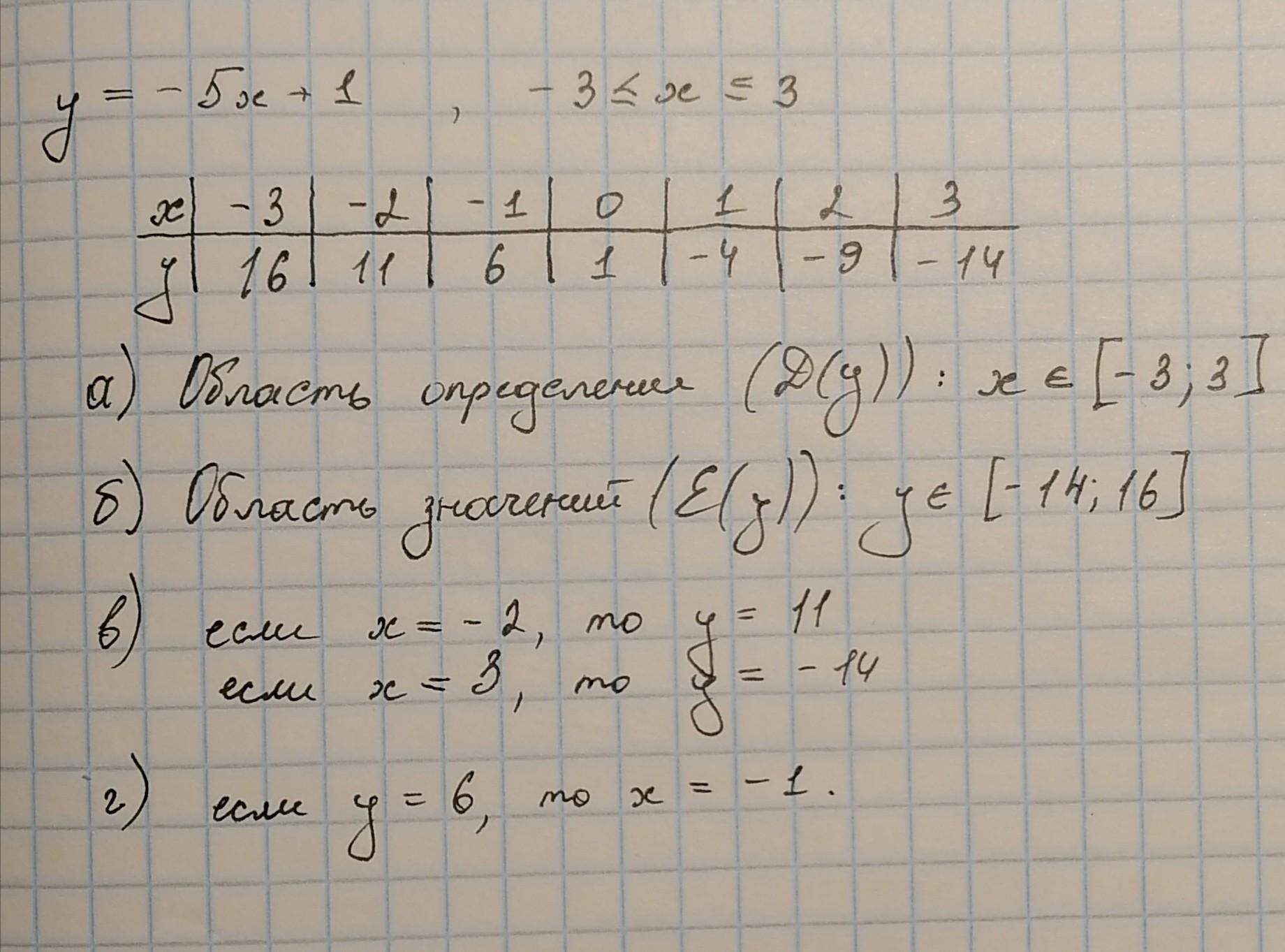 Функция задана формулой в 3-5х + 1, где -3 <х<3. Составить таблицу значений функции с шагом 1. Используя таблицу, отыскать: а) область определения функции; б) область значений функции; в) значение у, если г) значение х, которым соответствует