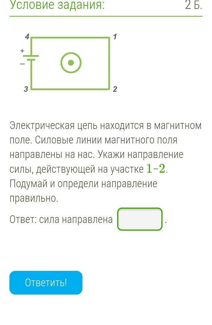 Ток идёт от + к -. Вниз. 4 пальца вниз. Тогда большой отогнутый палец покажет направление силы Ампера ВЛЕВО.