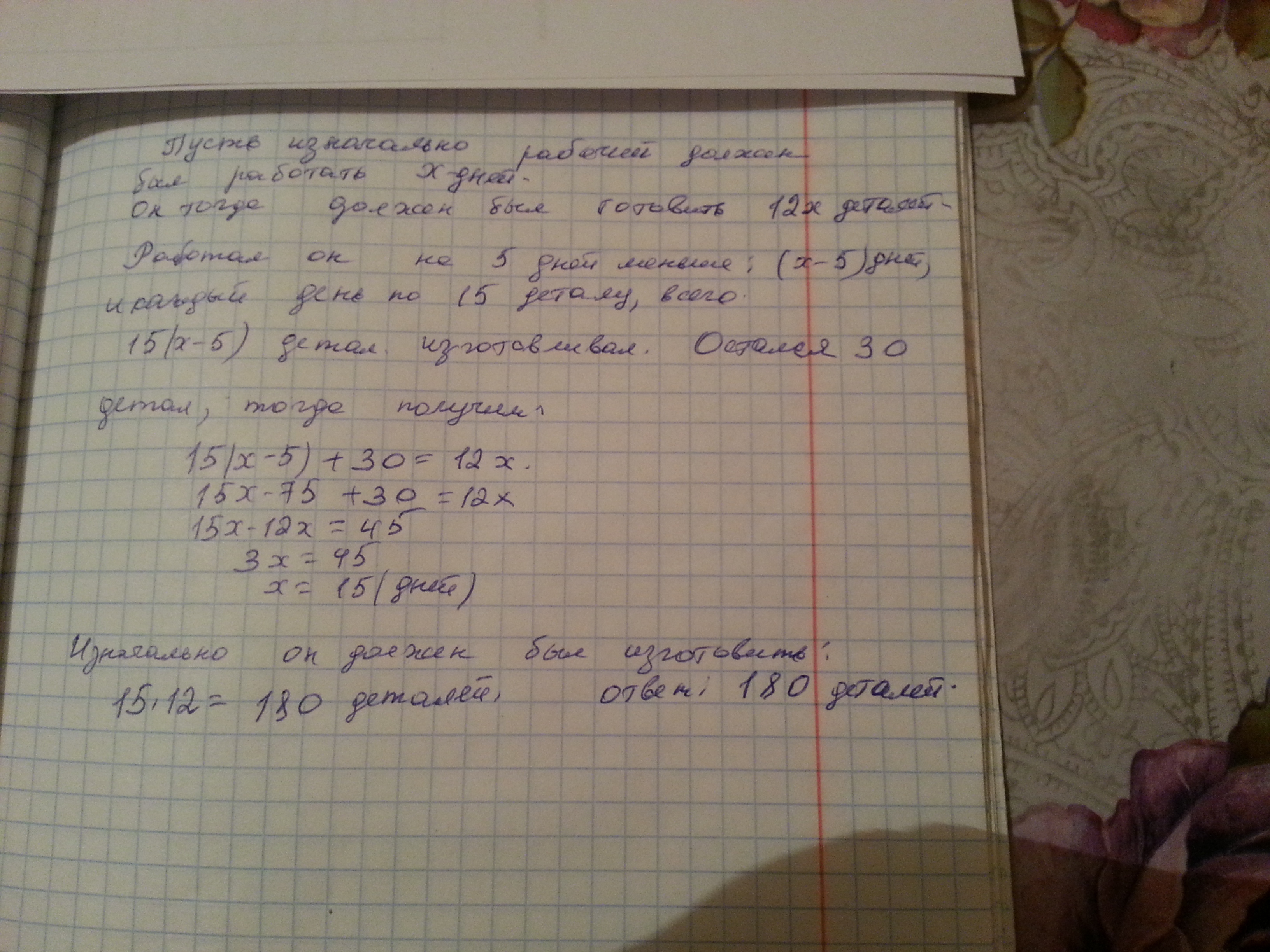Рабочий должен был изготавливать по 12 деталей каждый день, однако он изготавливал по 15 деталей и уже за 5 дней до окончания срок работы ему осталось изготовить 30 деталей. Сколько деталей должен был изготовить рабочий??? помогите пожалуйста. надо срочно . Заранее благодарствие))