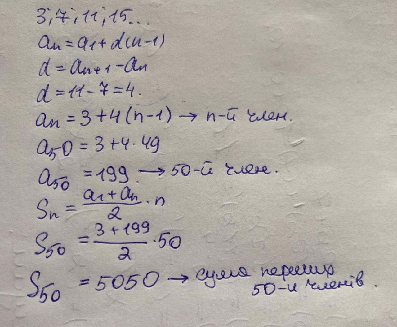 послідовність 3,7,11,15,...-арифметична прогресія . визначте її n-й,50-й члени і суму перших п'ятдесяти членів