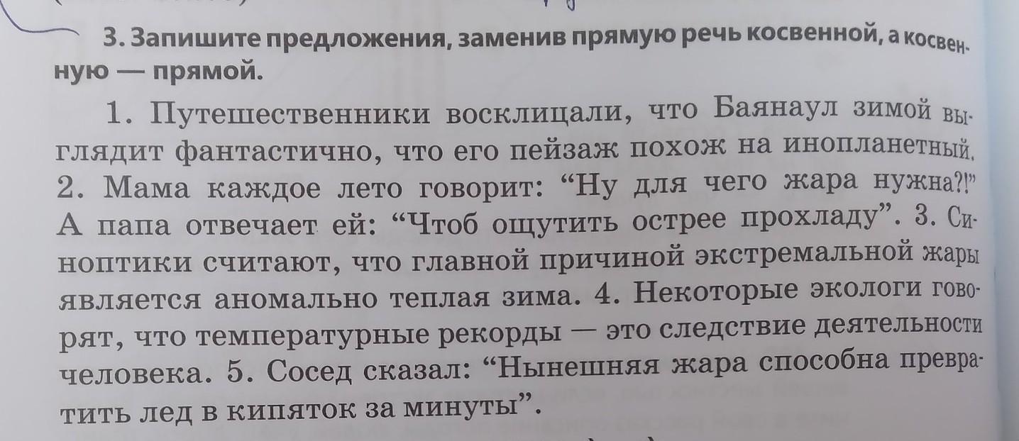3. Запишите предложения, заменив прямую речь косвенной, а косвен- ную — прямой. 1. Путешественники восклицали, что Баянаул зимой вы- глядит фантастично, что его пейзаж похож на инопланетный, 2. Мама каждое лето говорит: "Ну для чего жара нужна?!” А папа отвечает ей: "Чтоб ощутить острее прохладу”. 3. Си ноптики считают, что главной причиной экстремальной жары является аномально теплая зима. 4. Некоторые экологи гово- рят, что температурные рекорды - это следствие деятельности человека. 5. Сосед сказал: "Нынешняя жара способна превра тить лед в кипяток за минуты”.