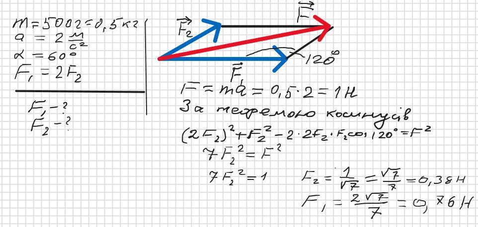Двi сили, одна з яких удвічі більша за iншу, дiють на тіло, маса якого дорівнюс 500 г. і надають йому прискорення 2 м/с². Кут мiж напрямами сил -60%. Визначте величину кожної сили.