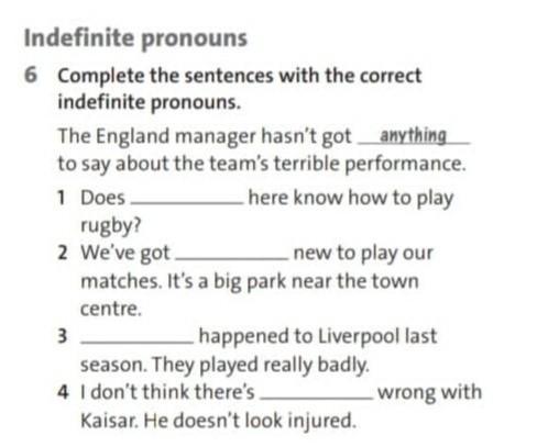 Indefinite pronouns 6 Complete the sentences with the correct indefinite pronouns. The England manager hasn't got_anything to say about the team's terrible performance. 1 Does here know how to play rugby? 2 We've got new to play our matches. It's a big park near the town centre. 3 happened to Liverpool last season. They played really badly. 4 I don't think there's wrong with Kaisar. He doesn't look injured.
