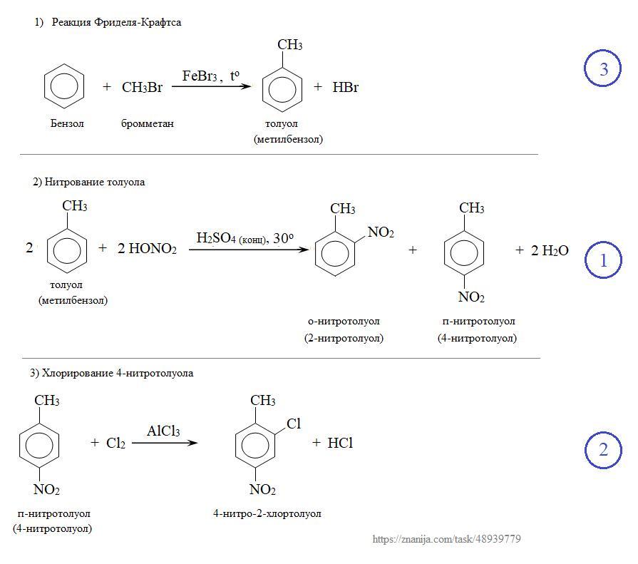 1) Из бензола получим толуол (метилбензол) по реакции Фриделя-Крафтса (алкилирование в присутствии кислот Льюиса - катализаторов кислотного характера AlCl₃, FeBr₃ и др.).