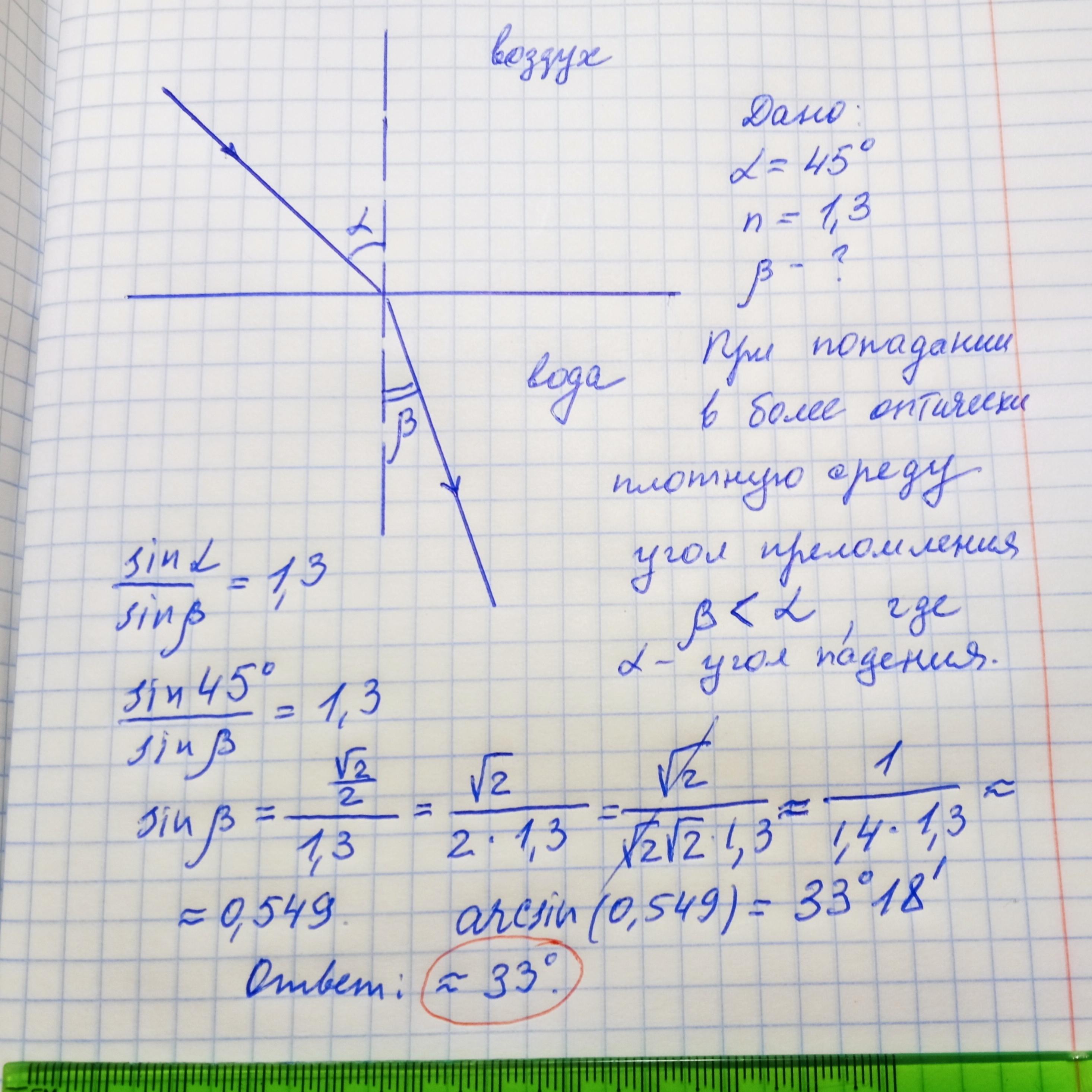 Угол падения луча на границу раздела воздух - вода равен 45°. Найти угол преломления, если показатель преломления составляет 1,3.