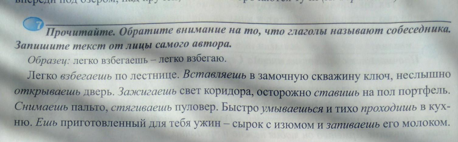 Легко взбегаешь по лестнице — легко взбегаю по лестнице. Вставляешь в замочную скважину ключ, неслышно открываешь дверь — вставляю в замочную скважину ключ, неслышно открываю дверь. Зажигаешь свет коридора, осторожно ставишь на пол портфель — зажигаю свет коридора, осторожно ставлю на пол портфель. Снимаешь пальто, стягиваешь пуловер — снимаю пальто, стягиваю пуловер. Быстро умываешься и тихо проходишь в кухню — быстро умываюсь и тихо прохожу в кухню. Ешь приготовленный для тебя ужин — сырок с изюмом и запиваешь его молоком — ем приготовленный для тебя ужин — сырок с изюмом и запиваю его молоком.