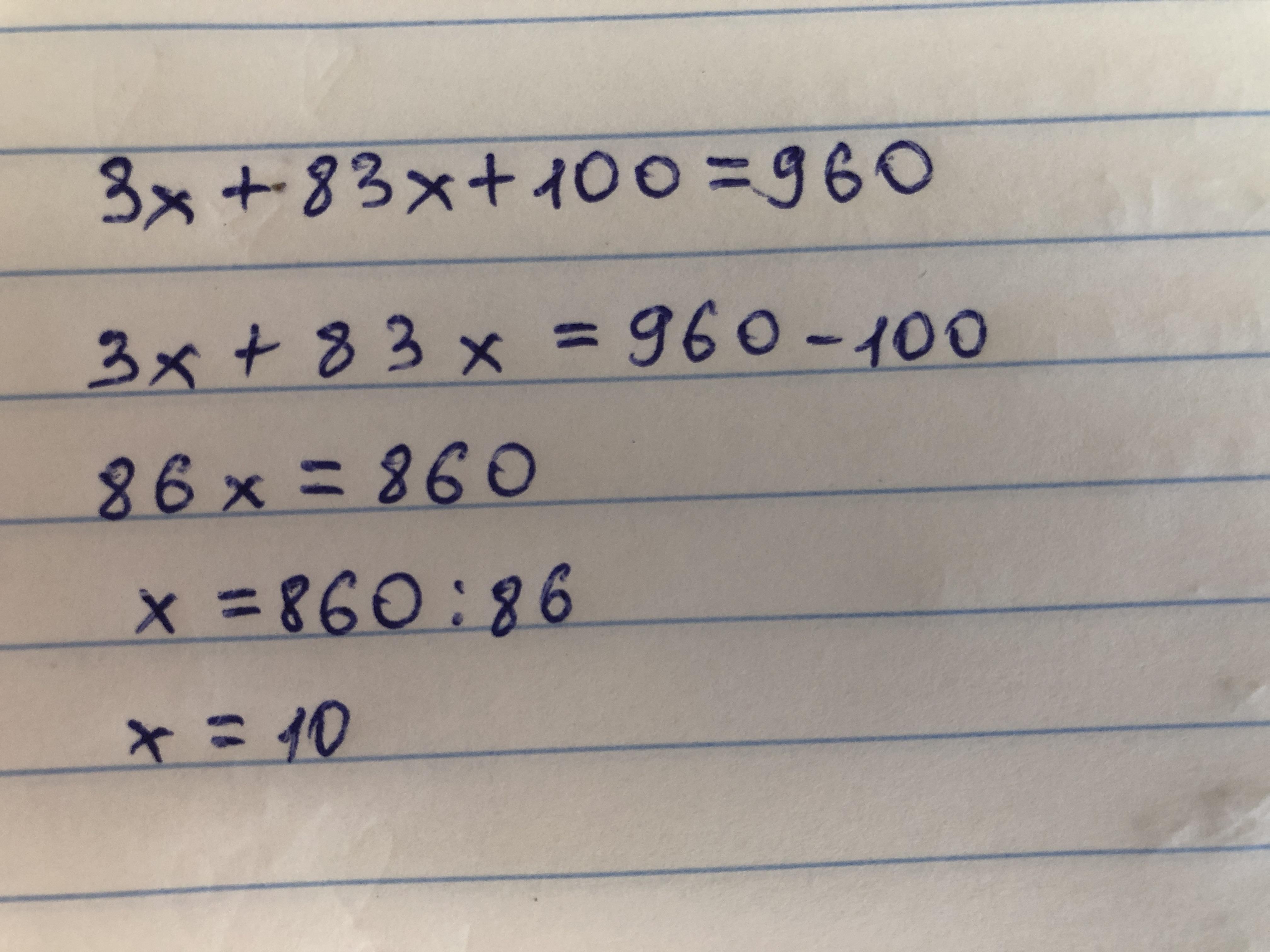 САМОСТОЯТЕЛЬНАЯ РАБОТА 4 Реши уравнение, упростив выражение в левой части. 3х + 83x + 100 = 960