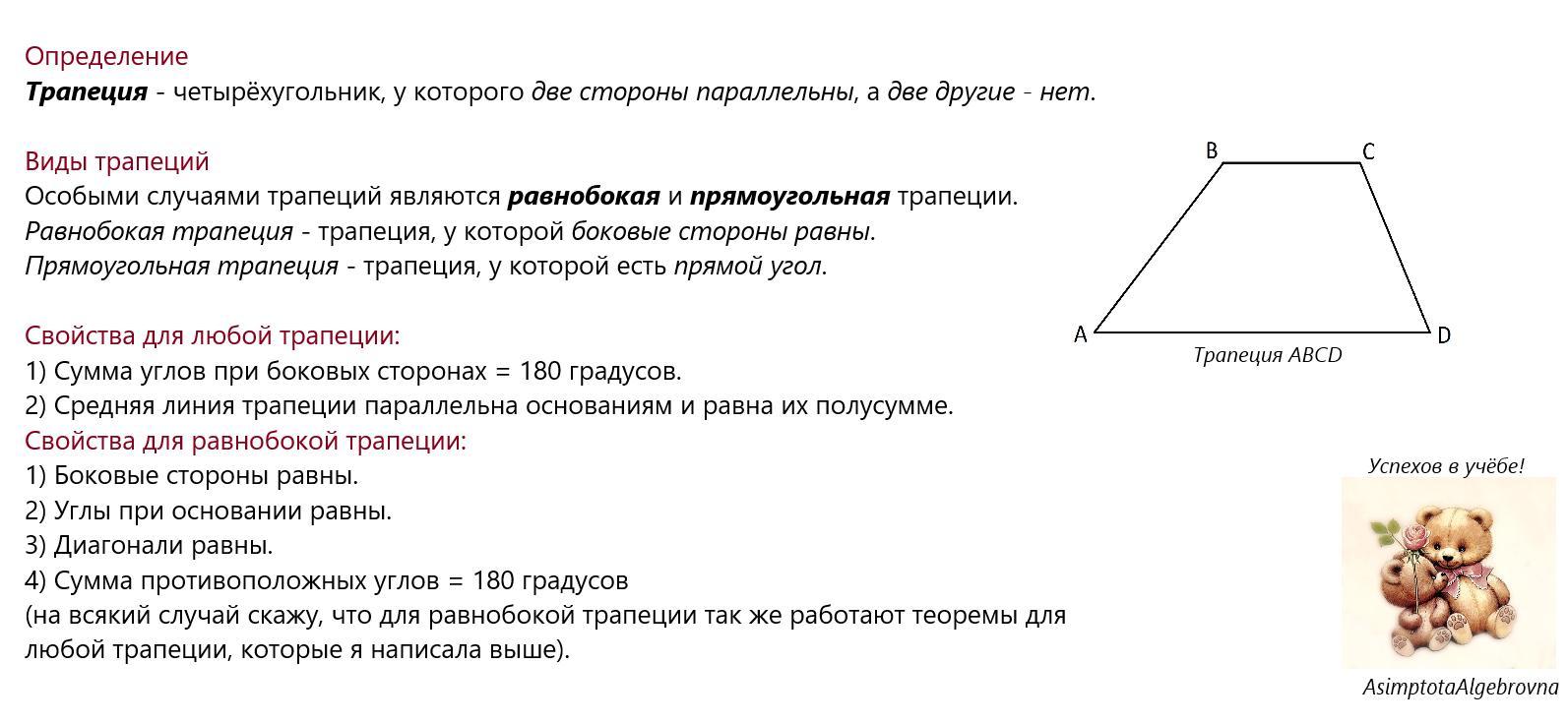 1.Трапеция(Определение,название сторон,виды,свойства)