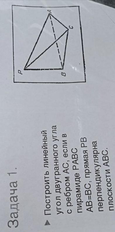 Построить линейный угол двугранного угла с ребром AC, если в пирамиде PABC: AB = BC, прямая PB перпендикулярна плоскости ABC