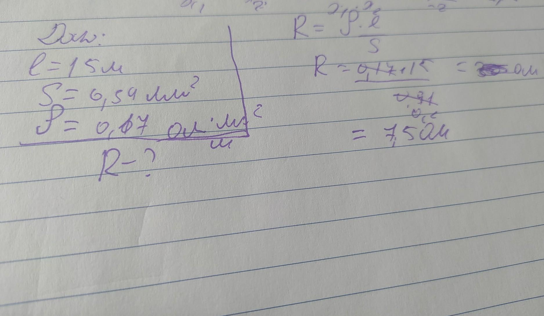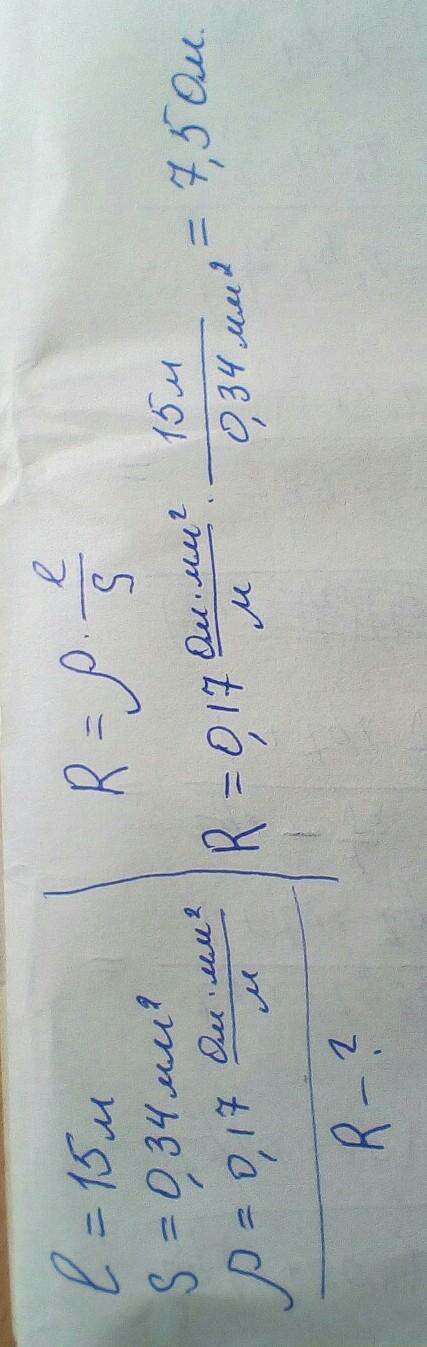1. Определите сопротивление медной проводки длиной 15м и сечением 0,34мм². Удельное сопротивление меди 0,17 Ом•мм/м