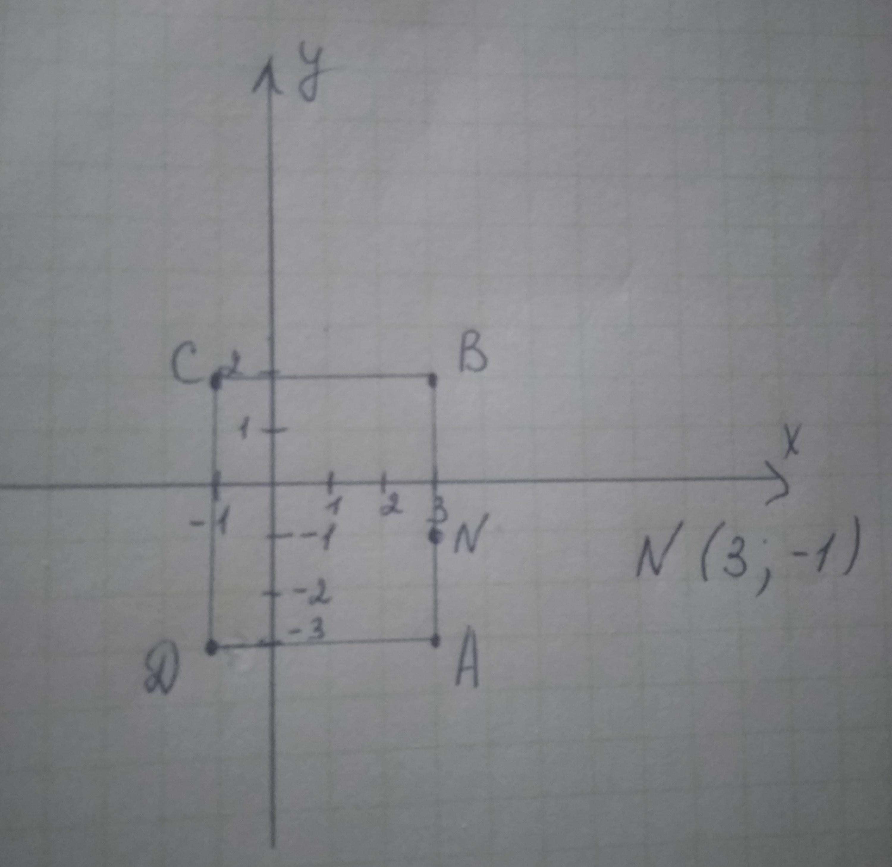 Начертите на координатной плоскости прямоугольник ABCD,если А(3;-3),В(3;2),С(-1;2),D(-1;-3).Отметьте на стороне АВ точку N,ордината которой равна -1.Запишите координаты точки N.