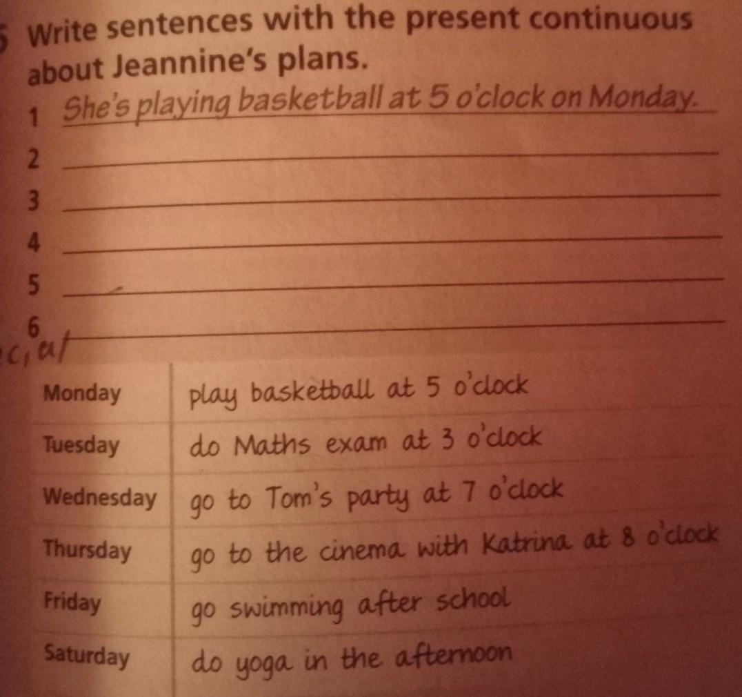 7 5 Write sentences with the present continuous about Jeannine's plans. She's playing basketball at 5 o'clock on Monday. 2 4 5 6