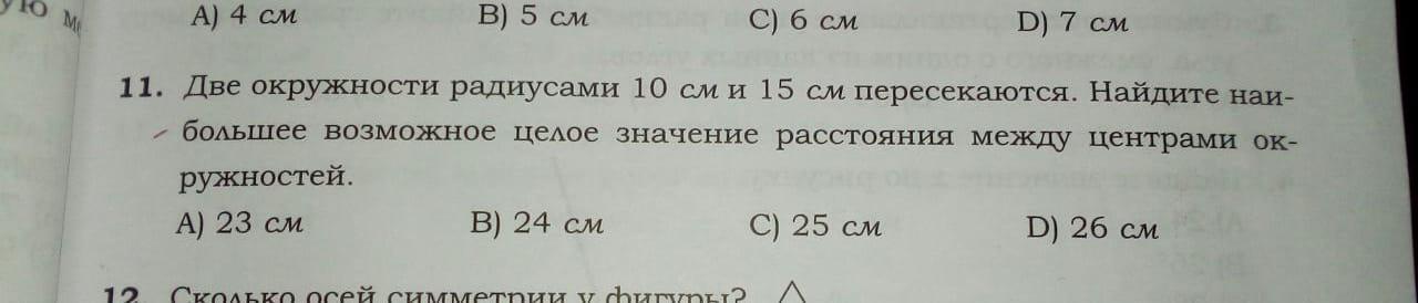 Если бы окружности "касались" друг друга, имея одну общую точку, то ответом бы была сумма из радиусов. Но у нас сказано "пересекаются". Значит, расстояние будет на несколько миллионых долей меньше. Наибольшее целое - 24.