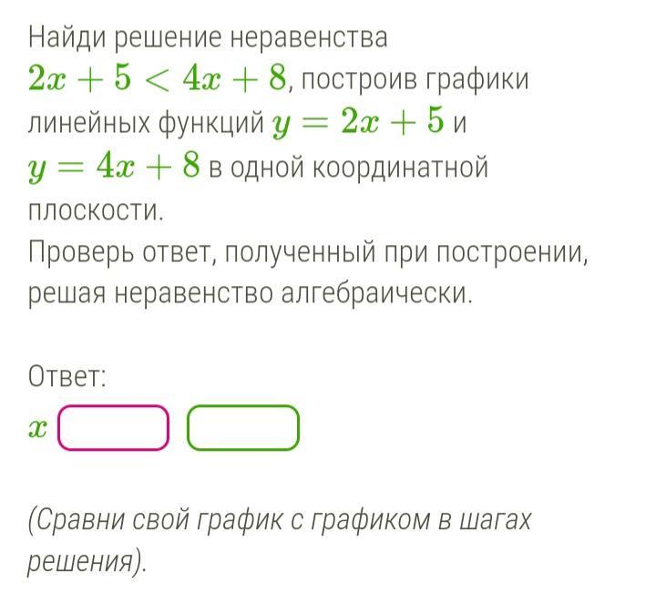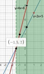 Смотрим, где на координатной плоскости график y=2x+5 (синяя линия) расположен "ниже" графика y=4x+8 (красная линия).