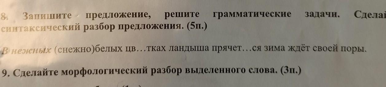 Зима-подлежащее, прячется,ждет- сказуемые, нежных-определение, снежно-белых-определение, в цветках-обстоятельство, ландыша-дополнение