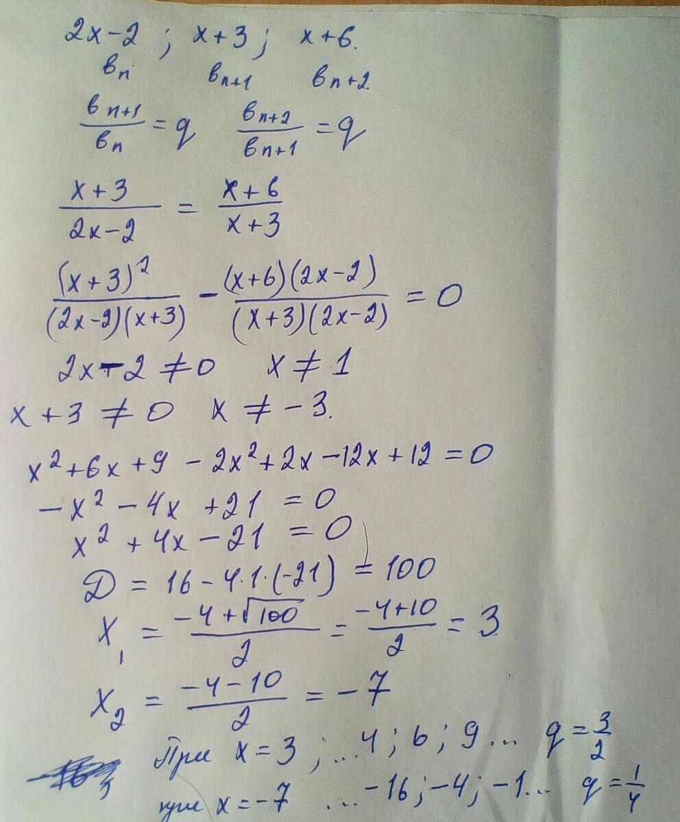 При якому від'ємному значенні х вирази 2х-2, х+3 та х+6 є послідовними членами геометричної прогресії?