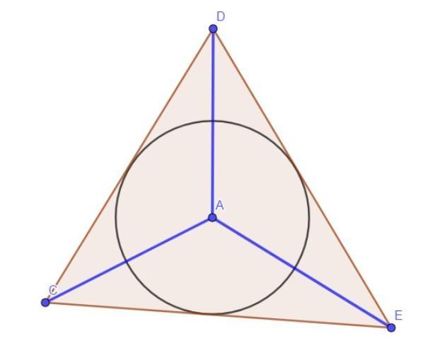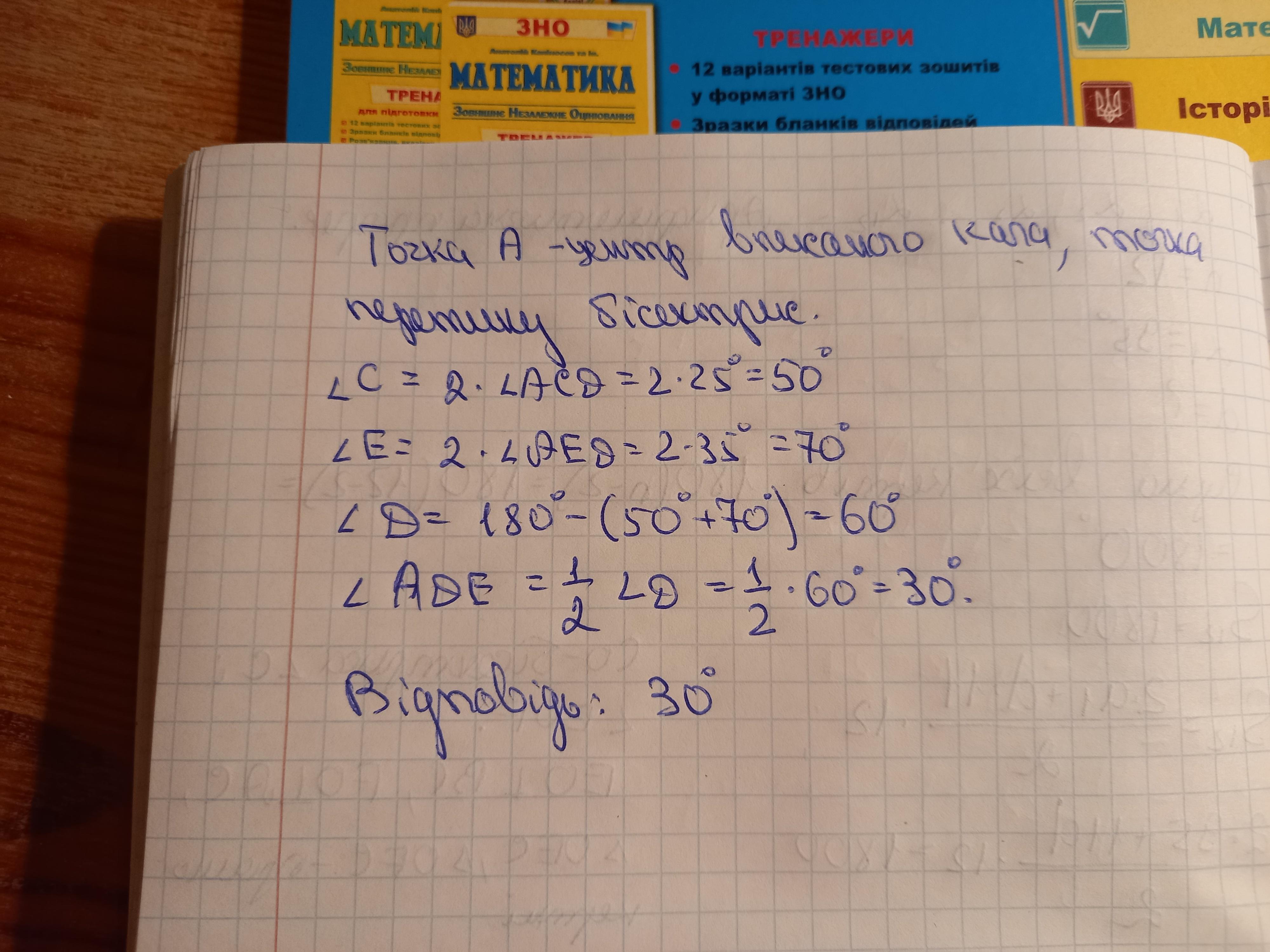 В трикутник CDE вписано коло з центром в точці А. Знайдіть ∠ADE трикутника, якщо ∠ACD = 25°, а ∠AED = 35°