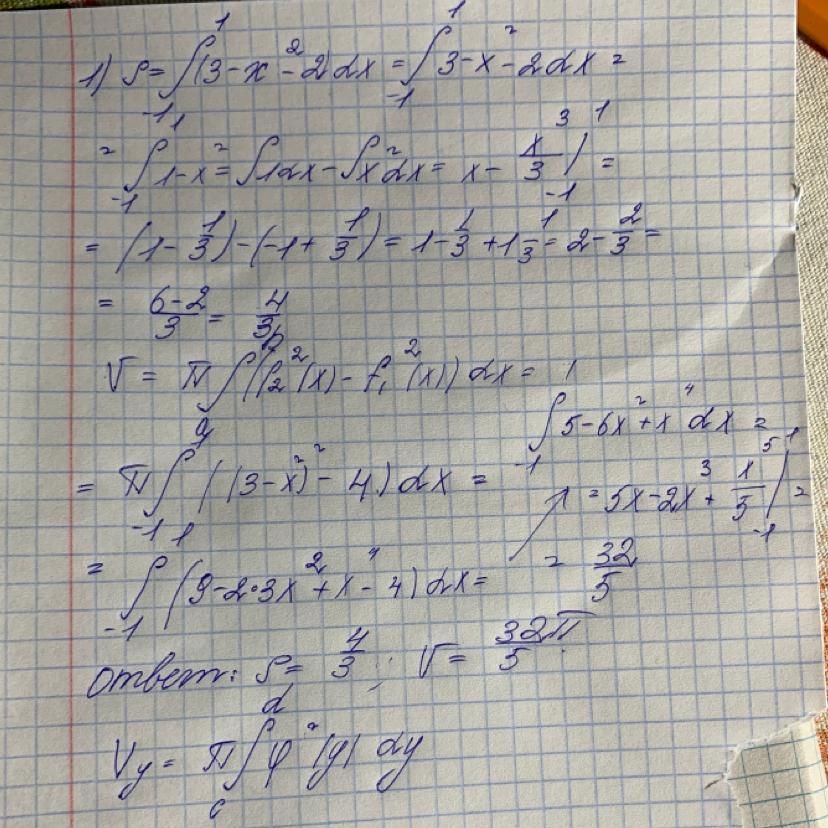 Вычислить площадь фигуры, ограниченной линиями и объем тела вращения этой фигуры вокруг оси Ox : y=3-x^2; y=2