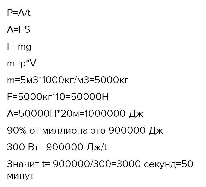 сколько времени необходимо для подъёма воды 5 кубических из колодца 20 м если мощность насоса составляет 0. 9квт если на подъём воды идёт 90 %от всей совершенной работы