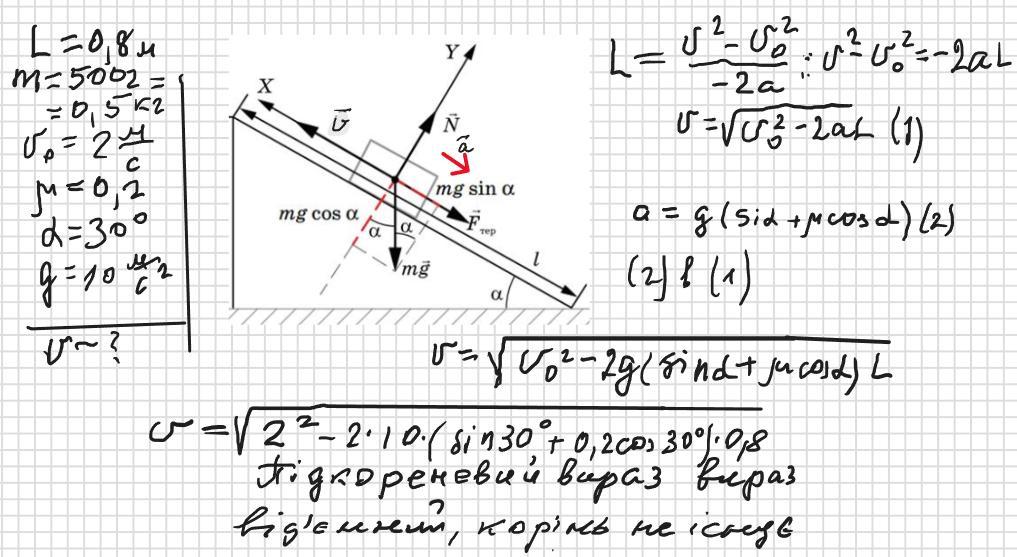 Вверх по похилій площині рухається брусок масою 500 г. Початкова швидкість бруска 2 м/с, коефіцієнт тертя бруска по похилій становить 0,2, кут при основі 30 градусів. Визначіть яка швидкість бруска на вершині похилої. L=0,8м.