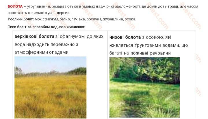 Відмінні риси: болота -це надмірно зволоженні тереторіі в той час як більшість степів пристосовані до більш посушливих періодів .