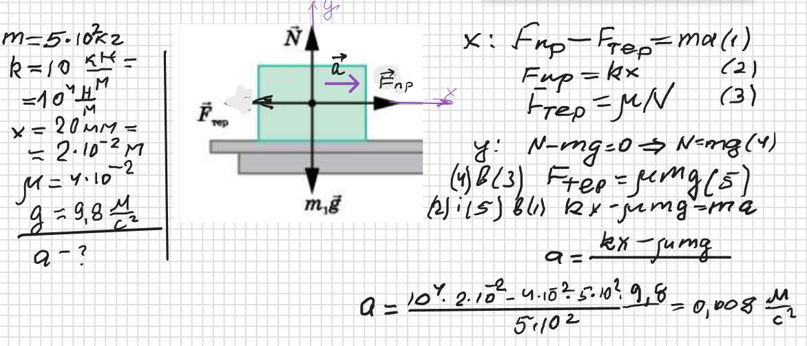 Сани масою 500 кг буксирують за допомогою троса, жорсткість якого 10кН/м, причому його видовження дорівнює 20 мм. З яким прискоренням рухаються сани, якщо коефіцієнт тертя дорівнює 0,04?