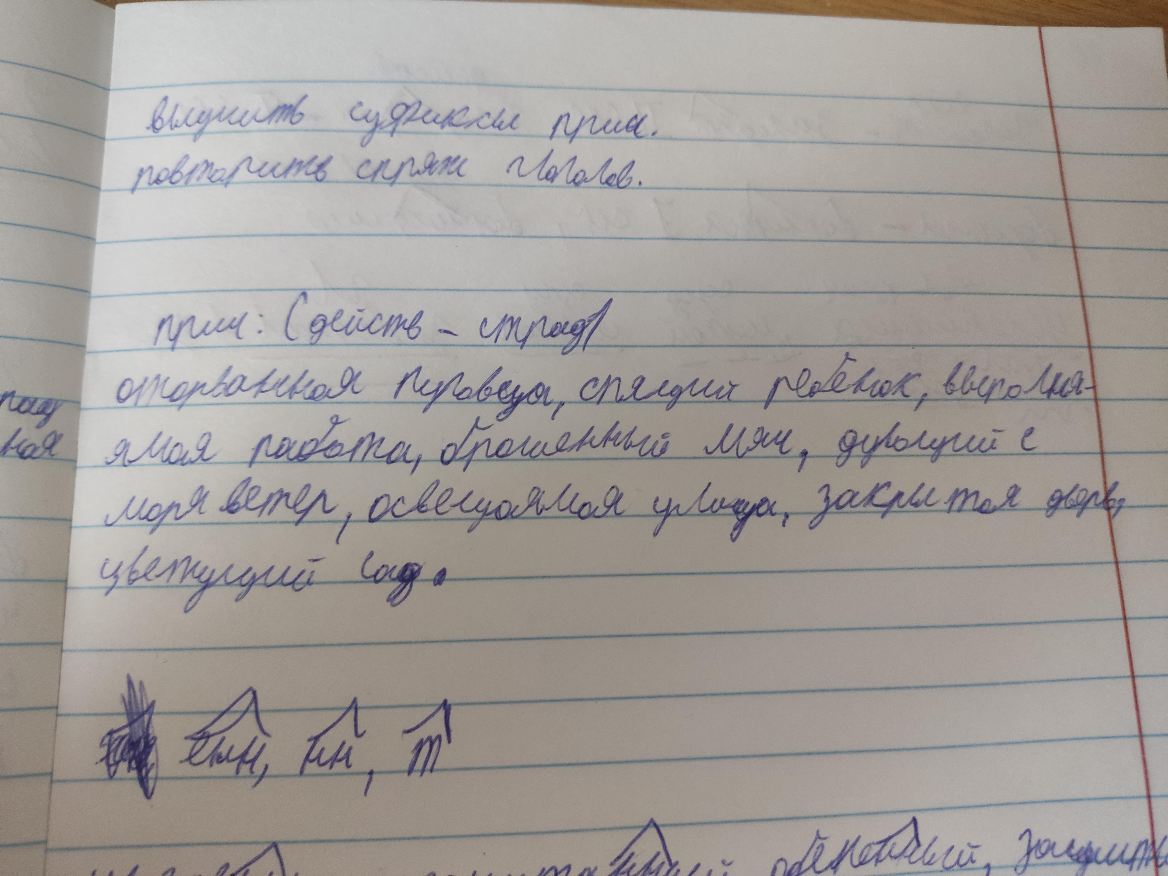 действительные : спящий ребёнок, оторванная пуговица, дующий с моря ветер, закрытая дверь, цветущий сад
