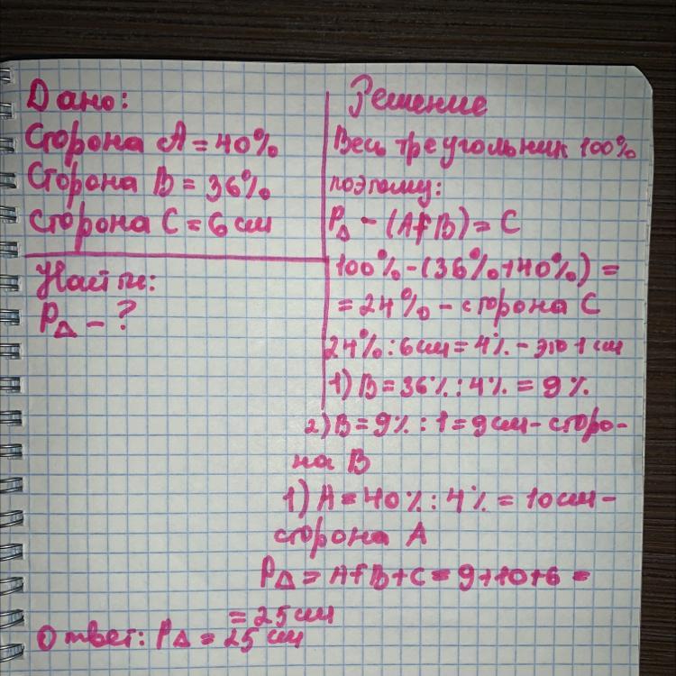 Тогда, поскольку 24% периметра — 6 см, 1% периметра будет равен