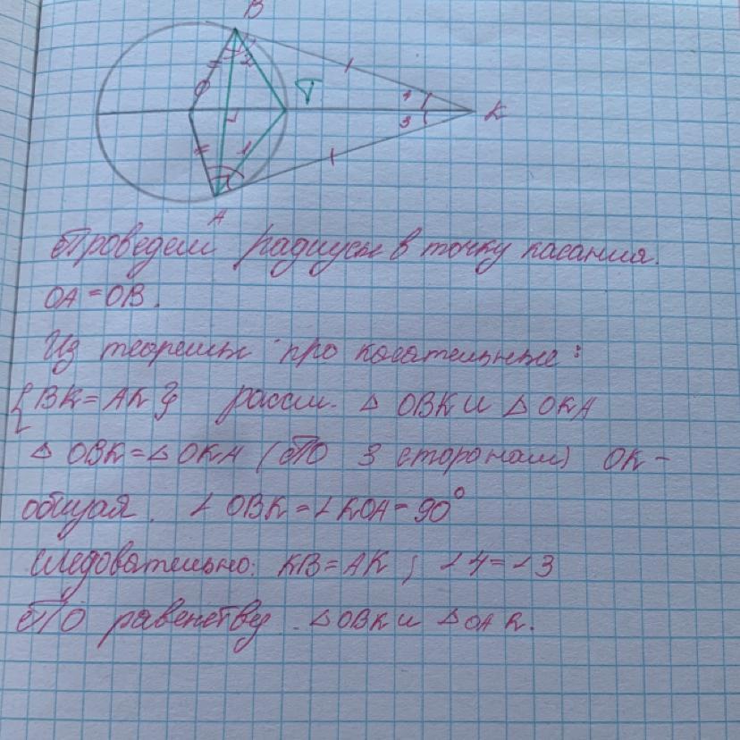 Так как треугольники ОВК и ОАК являются равными, то и углы у них равные. А значит ОК биссектриса
