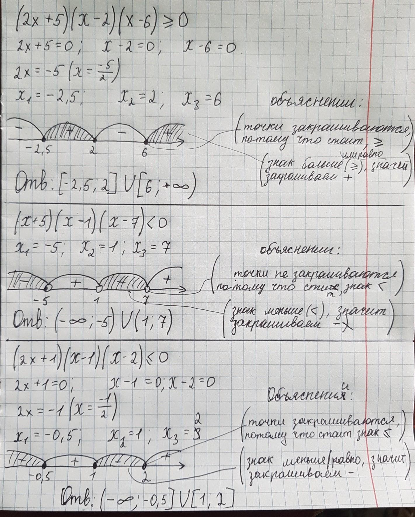 Решите методом интервалов неравенство: (2х+5) (х-2) (х-6)≥0, (х+5) (х-1) (х-7)‹0, (2х+1) (х-1) (х-2)≤0.