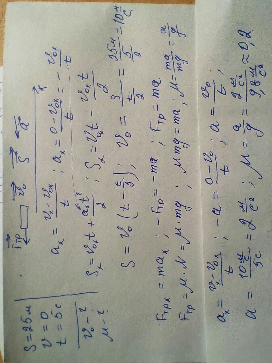 Автомобіль починає гальмувати і проїзжає відстань 25 метрів до повної зупинки за 5 секунд. Яка початкова швидкість автомобіля і коефіцієнт тертя коліс?