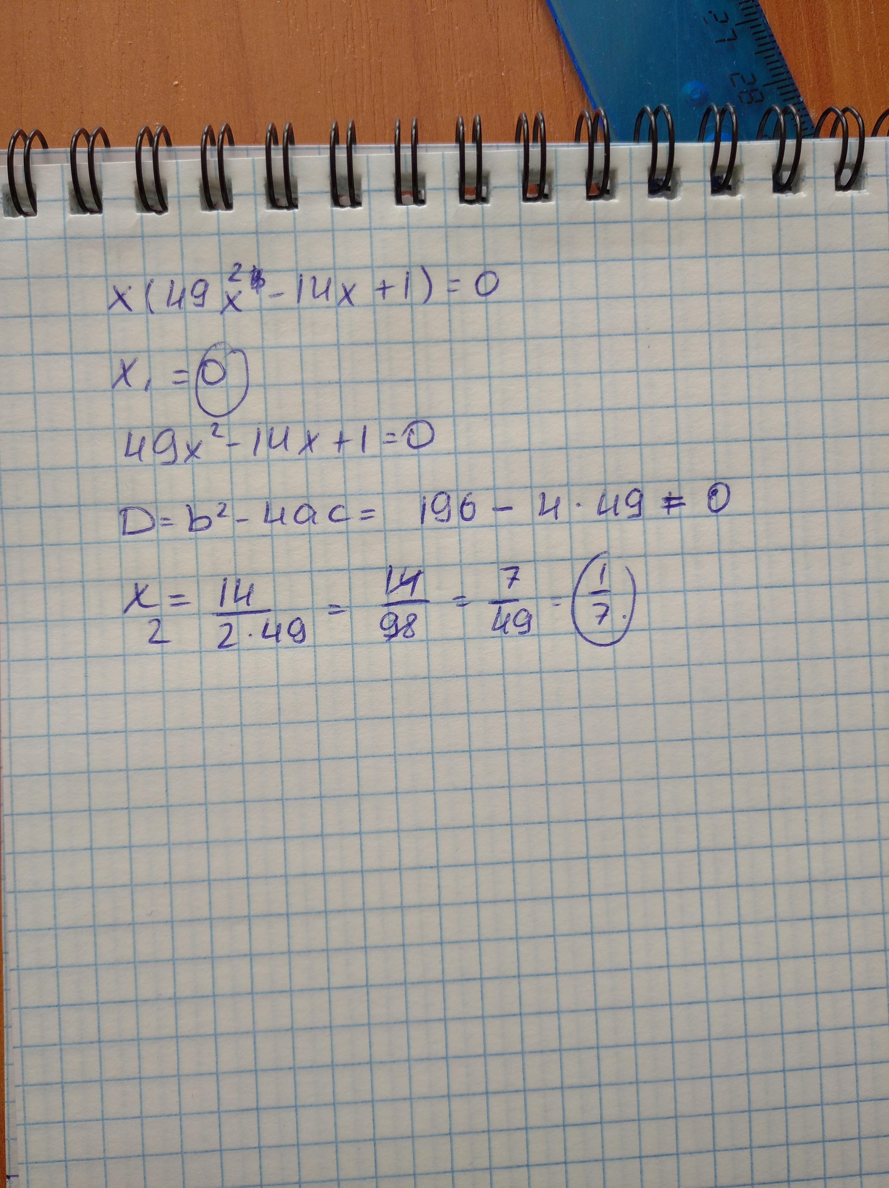 Для вычисления корней 49x3 + 14x2 + x = 0 мы прежде всего начнем с того, что вынесем общий множитель x за скобки и получим: