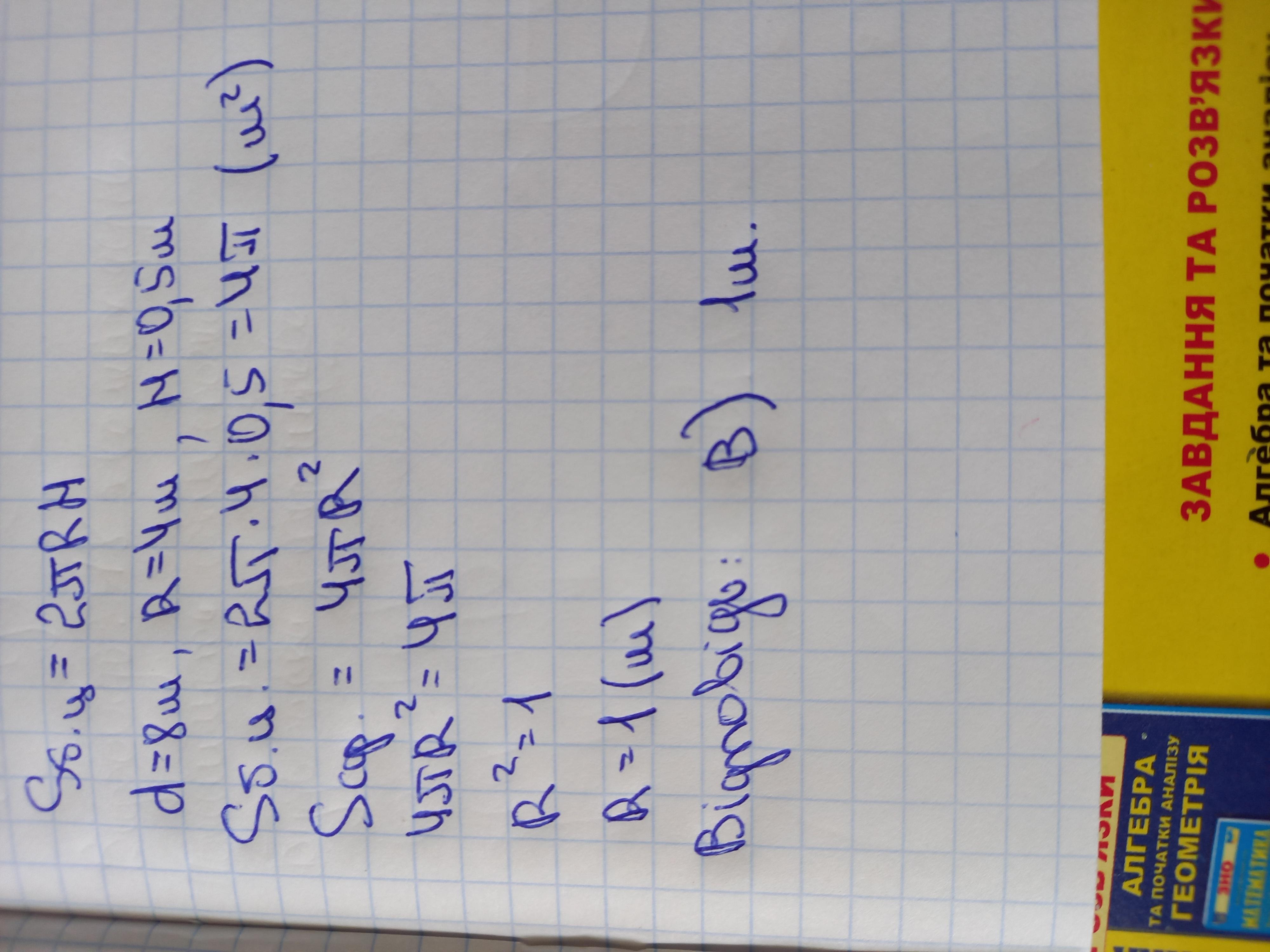 Обчисліть радіус сфери, якщо відомо, що площа її поверхні дорівнює площі бічної поверхні циліндра з діаметром 8м і висотою 0,5 м.